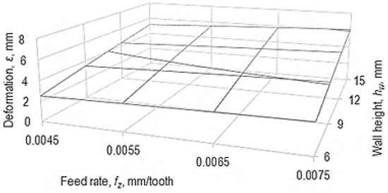 Influence exerted by the feed rate fz and the wall height hw on the value of deformation ε (v = 100 m/min, tt = 1.2 mm, tw = 0.2 mm, ww = 10 mm).