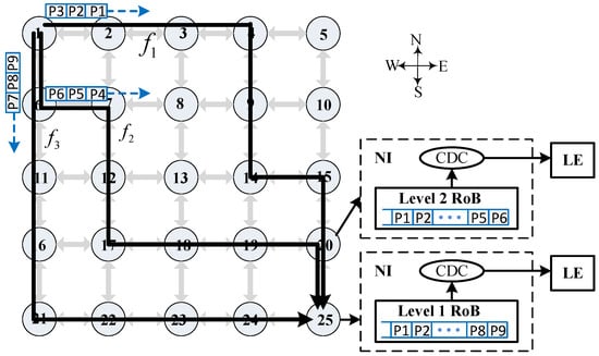 The traditional local reordering approach waits until all data packets have arrived and performs total ordering, which consumes both excessive hardware resource usage and reordering time. Longer transmission delay not only exacerbates system performance but may also cause heavier traffic congestion, probably resulting in the deterioration of thermal efficiency. The power density of an NoC router is typically higher than the average power density of the processing elements [5], and thus the traditional local reordering solution may cause severe thermal problems. For instance, Figure 1 presents an illustrative example for local reordering of data packets, where f denotes an infinite flow of unicast traffic sent from the source router 1 to the destination router 25. A multipath routing algorithm is employed, splitting f into three different subflows, namely f 1 , f 2 and f 3 . Let us assume that the package IDs are smaller in f 1 , medium in f 2 , and larger in f 3 . We further assume an unbalanced network congestion, resulting in out-of-order delivery of data packets. Traditional approaches perform reordering of packets at router 25, utilizing a reorder buffer (RoB) as part of the network interface.