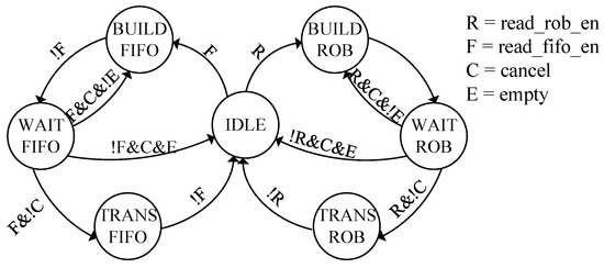 The boundary of two areas, namely the RoB and FIFO area, is indicated by a pointer, which enables elastic operation of both areas. The fundamental operation of a router containing the proposed MRB in each input channel is controlled by a finite-state machine (FSM), as shown in Figure 4. The initial state of the FSM is named IDLE. From the IDLE state, the FSM transits to the BUILD-RoB state upon the arrival of a data packet of the target flow, and a request signal is sent to the decoder and the crossbar. Then, it enters the WAIT-RoB state by withdrawing the request signal for the decoder and maintaining the request signal for the crossbar. When the data packet is in the correct order, it is forwarded in the TRANS-RoB state, while the request signal for the crossbar is still asserted. The FSM is initialized to the IDLE state after the data packet is forwarded. When a data packet that does not require reordering arrives, the FSM changes to the BUILD-FIFO state. The WAIT-FIFO and TRANS-FIFO states behave similarly to the WAIT-RoB and TRANS-RoB state, respectively, except for that they perform only buffering before packet forwarding instead of reordering.