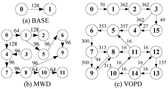 Figure 5. The task graphs of the BASE, MWD and VOPD benchmarks. The number in the circle represents node ID. The number beside the arrow represents the amount of communication between the two tasks.