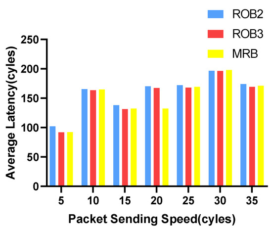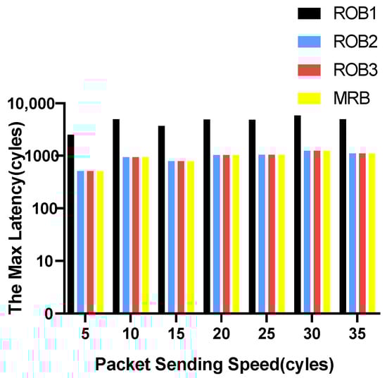 We vary the packet sending speed and measure the maximum and average transmission latency of data packets. The experimental results for VOPD are shown in Figure 6 and Figure 7. RoB-1 has the worst average and maximum latency, approximately ten times more than the other three solutions. The latency for RoB-2, RoB-3 and MRB are similar. The results for MWD are shown in Figure 8 and Figure 9. We remove RoB-1 from the benchmarks. For MWD, our MRB achieves the best average and maximum latency, especially at the sending speed of 20.