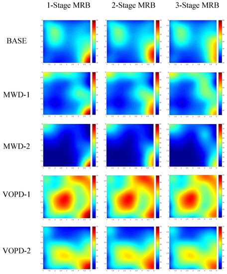 In order to evaluate the thermal efficiency for different MPR settings, we set up three types of reordering scenarios, namely 1-Stage MRB, 2-Stage MRB and 3-Stage MRB. The target and contention flow settings are the same as those in Section 5.2. The target flow is split into four subflows, allowing a maximum of three stages of packet reordering. For scenarios 1-Stage MRB, 2-Stage MRB and 3-Stage MRB, we perform packet reordering in single-stage, two-stage and three-stage, respectively. The highest temperature values of all thermal maps depicted in Figure 11 are shown in Table 4. As seen from the table, 1-Stage MRB is practically the traditional packet reordering strategy. Compared with 1-Stage MRB, our MPR achieved 14.3% hotspots reduction on average. For each benchmark, the highest temperature keeps dropping as the stage of packet reordering increases. The largest improvement occurs for MWD-2, where the highest temperature is reduced by 18.9% using three stages of packet reordering. The experiments in this subsection effectively verify the hotspots reduction capability of our proposed MPR approach.