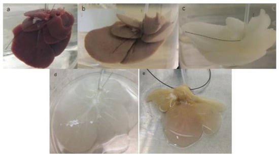 Evolution of decellularization and recellularization over time. Fresh liver placed in the system (a). Liver after 24 h perfusion with distilled H2O, showing a loss of coloration (b). Liver after infusion for 24 h with sodium dodecyl sulfate (SDS), showing a translucent coloration, indicating cell removal (c). Decellularized liver (d). Recellularized liver after seven days of cultivation in the bioreactor (e).