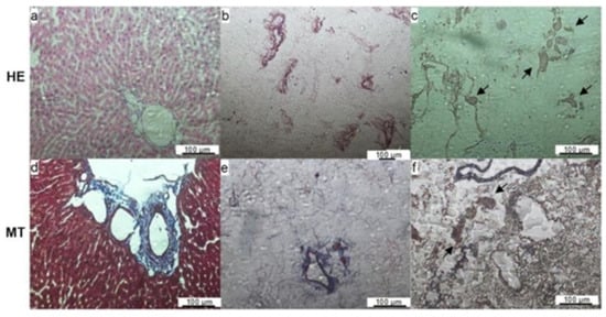 Histological sections of fresh (a,d), decellularized (b,e), and recellularized livers (c,f) after staining with hematoxylin & eosin (HE) or Masson ’s trichrome (MT). The absence of nuclei and maintenance of the extracellular matrix can be observed in the decellularized liver images. The presence of cells on the images of the recellularized liver (arrows) indicates that the cells were able to migrate from the vessels to the tissue. Scale bar represents 100 μm.