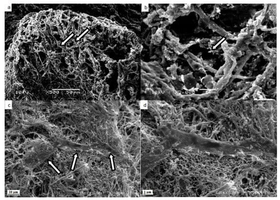 The histological evaluation with HE showed some cells present close to the vessel space in the recellularized matrix (Figure 3c). Masson’s trichrome staining showed the maintenance of ECM components such as the collagen web in the recellularized matrices (Figure 3f). The SEM images show MCSs attached to the matrix fibers, confirming that the matrix was recellularized by the protocol (Figure 4c,d).