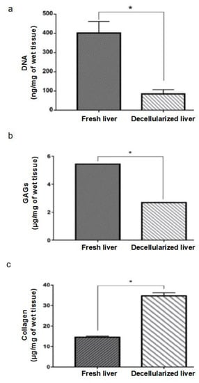 DNA quantification. Decellularized livers showed 84.8 ± 13.0 ng/mg DNA (n = 3), less than 100 ng/mg of wet tissue, which characterizes the absence of cells, in accordance with the literature. Fresh livers showed 401.6 ± 34.8 ng/mg DNA (n = 3). Values expressed as mean and standard deviation. * p < 0.05 by the Student t-test (a). Quantification of glycosaminoglycans (GAGs). Decellularized livers maintained approximately 50% of the amount of GAGs (2.69 ± 0.01 μg/mg, n = 3) found in the fresh liver (5.41 ± 0.01 μg/mg, n = 3). Values expressed as mean and standard deviation. * p < 0.05 by the Student t-test (b). Collagen quantification. Decellularized livers showed an increase in the amount of collagen per tissue mass (34.76 ± 0.87 μg/mg, n = 3) when compared to the fresh liver (14.58 ± 0.30 10 μg/mg, n = 3). Values expressed as mean and standard deviation. * p < 0.05 by the Student t-test (c).