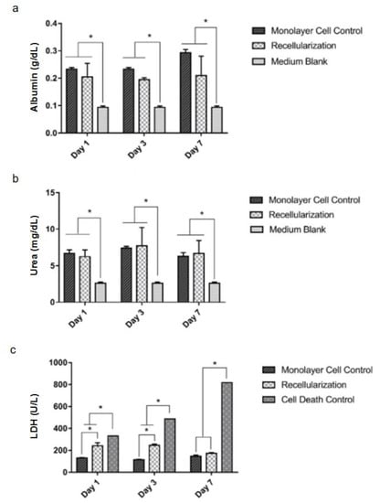 Results of functional analyses of recellularized livers. Albumin (g/dL) (a). Urea (mg/dL) (b). Lactate dehydrogenase (LDH in units per liter, U/L) (c). Medium blank represents the medium used for the cell culture to remove color interference. Data presented as mean and standard deviation, n = 3. * p < 0.05 by two-way ANOVA followed by Tukey HSD post hoc test.