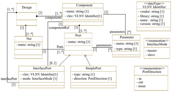 The IP-XACT specification developed by the SPIRIT consortium offers a standard XML description of IP meta-data independent of the used language. This facilitates system integration using compatible descriptions from multiple component vendors and allows IPs to be easily reused and exchanged between electronic design automation (EDA) tools for SoCs []. Therefore, this standard has been increasingly used lately in FPGA tools. In the context of model-driven designs, IP-XACT can be used as an intermediate representation to go from high-level models to executable code.