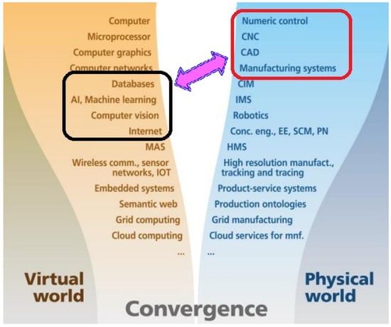 The manufacturing processes are becoming increasingly complex, dynamic and networked as industrialization progresses toward global connections []. Thus, significant progress toward the cyber physical systems (CPS) through the internet-of-things (IoT) with the integration of sensors, data analytics, automation and robotics is leading to the pervasive digitalization of the factory operations. Therefore, enterprises are adopting innovation in computing, information systems and communication technology to converge with manufacturing science and production technology, as observed in the parallel development of the virtual and physical world, as illustrated in Figure 1 []. Moreover, adopting cloud technologies enables delivering and receiving services via an intelligent system leading to cloud manufacturing (CMfg) []. In this regard, the blockchain technology can be an enabler in the manufacturing industry, specifically in cloud manufacturing, with the benefits of tamperproof recording in the decentralized or remotely operated processes []. This will support the smart systems in mass-producing highly customized products that require end-to-end integration of different autonomous manufacturing operations []. Additionally, intelligent robotics is undertaking delicate manufacturing tasks without human assistance []. This is evident from the advent of Industry 4.0 (I4.0), where the machinery development is accelerating towards the integration of software with multiple sensors in a smart factory environment [], where the focus of conventional manufacturing is shifting towards the incorporation of decision-making capabilities []. This self-organizing manufacturing system consists of autonomous elements (e.g., software tools, equipment and operators) connected in a dynamic environment to perform in an unforeseen condition []. Therefore, Industry 4.0 (I4.0) defines a new technological era [] of the intelligent factory architecture that will change the manufacturing processes driven by smart systems for self-structuring and self- monitoring []. Integration of these systems enables an intelligent manufacturing environment to yield productivity for high-quality customized products.