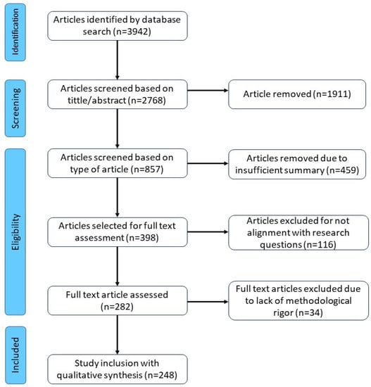 The focus of the review is targeted at specific keywords due to the high-volume availability of content. The search is conducted in scientific databases such, as Google Scholar and Science Direct. Google Scholar provides the information about the journal name, and publication year and the advanced search option helps to cover citations that are not covered by other databases. The search strings for the publication search are the following: ‘Intelligent’ OR ‘Smart’ OR ‘Intelligence’ AND ‘3D printing’ OR ‘Additive manufacturing’ OR ‘Direct manufacturing’ OR ‘Three-dimensional printing’ OR ‘Rapid prototyping’ OR ‘Digital manufacturing’ OR ‘Generative manufacturing’ OR ‘Additive fabrication’ OR ‘Solid free form fabrication’ OR ‘Rapid manufacturing’. About 3942 publications were found in the timeline 2005–2022, based on the search string on 31 December 2022. Then, the title of the articles were screened to remove duplicate articles and/or articles not related to this research, thereby 2768 articles were sustained. Various types of grey literature, presentation, keynotes and inaccessible publications were excluded, and the number of articles was reduced to 857. Then, the abstracts were read for subsequent evaluation to obtain the research question answers. About 398 articles were selected for full abstract reading synthesis to cover the review work. Then, 116 articles were removed for not aligning with the research questions and 282 articles went through the full text assessment. Finally, 248 articles were selected for qualitative synthesis for reviewing in the literature. The transparency of the results produced by the searching process included in a systematic review is thus highlighted by the risk of bias evaluation. A flowchart outlining the PRISMA algorithm focuses on the reporting of reviews, evaluating the effects of interventions and serves as a foundation for reporting systematic reviews in numerical form is illustrated in Figure 2.
