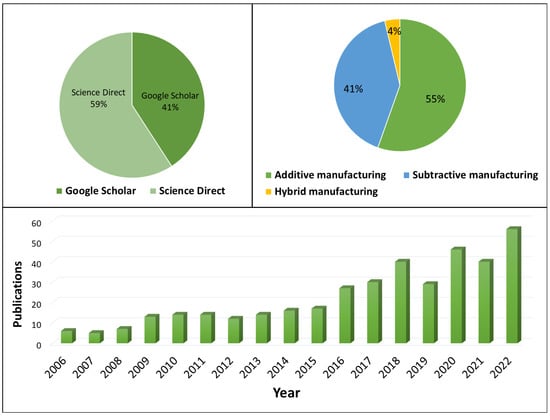 From the article qualitative synthesis, the present state-of-the-art intelligence in additive, subtractive as well as hybrid manufacturing has been produced. Moreover, the challenges and research gaps for the existing state for future expansion of intelligence related to manufacturing connectivity, in-situ monitoring systems, human to machine interference, machine learning application in the sensorial system, artificial intelligence in decision making, collaboration among robots, machine to machine cognitive, digitation and adaptability have been identified. The search engine papers percentage, proportion of AM and SM, hybrid manufacturing articles review and year growth of publications are summarized in Figure 3.