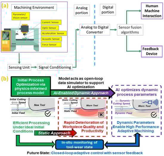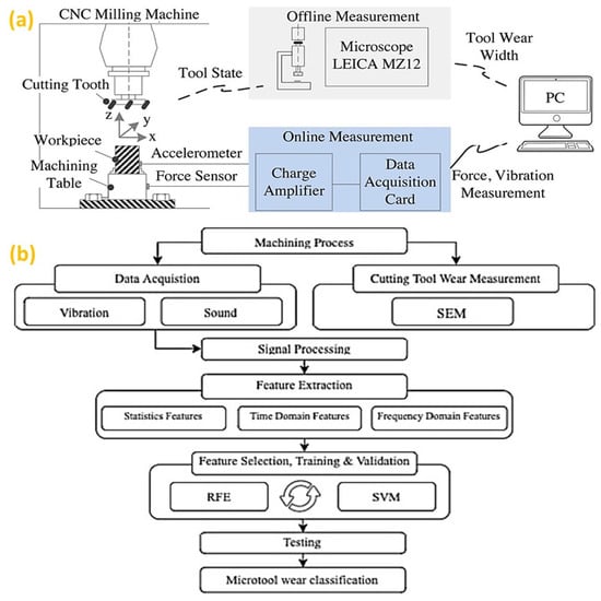 From an intelligent manufacturing context, the research focus has been directed toward intelligent machining [] with an aim for online monitoring and optimization of the machining parameters []. Thus, monitoring the machining state (i.e., tool condition, tool wear, machine stability, chatter, and vibration) becomes an important research area for intelligent subtractive manufacturing. Additionally, the prediction of tool wear is attracting attention to improve the part quality by reducing the scrap rates, thereby enhancing the productivity and sustainability of manufacturing operations []. The life cycle of the tool can be predicted from the offline measurement of tool flank wear, corresponding to the multi-sensor data collected online during a high-speed CNC machining experiment, as shown in Figure 5a []. Integrating physical knowledge with a data-driven model helps tool wear observation in a dynamic condition []. Figure 5b illustrates the framework to monitor tool wear in micro-milling processes []. The method first started by acquiring vibration and sound signals and then, by using scanning electron microscopy (SEM) images to detect the tool wear. Subsequently, the most significant features are selected by a recursive feature elimination (RFE) method from the various features related to statistical analysis, time domain and frequency. Once the features were selected, a support vector machine (SVM) model was created to predict tool wear. One of the shortcomings of this method is the off-line tool wear measurement by superimposing SEM images of the new and used tools.