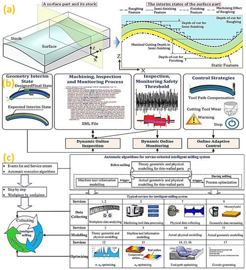 (a) Various depth-of-cuts in machining a freeform surface (reprinted with permission from []. Copyright 2015 Springer Nature). (b) Dynamic feature information and its applications (reprinted with permission from []. Copyright 2015 IOS Press). (c) Three parts of an intelligent milling system, including data collection, information modelling and process optimization (reprinted with permission from []. Copyright 2022 Elsevier B.V.).