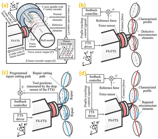 In-process measurement, repair, and evaluation method of defective microstructures on a roll mold illustrated as (a) the real-time detection of the defect positions; (b) characterization of the defect surface profiles; (c) repairing the defective microstructure elements; and (d) evaluating the repair results (reprinted with permission from []. Copyright 2014 Elsevier B.V.).