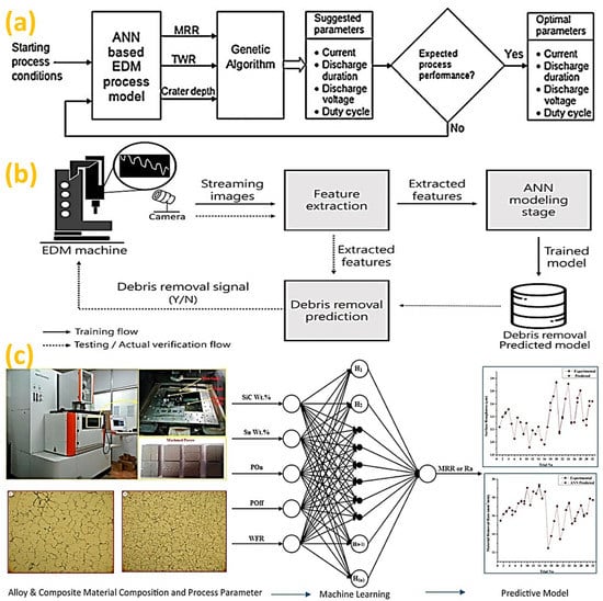 In addition to conventional machining, machining conditions were predicted for non-conventional processes []. Electrical discharge machining (EDM), one of the unconventional machining processes using electric energy to remove materials, has been widely used in high-performance engineering sectors []. An intelligent approach utilized for the optimization of die-sinking EDM parameters is illustrated in Figure 8a [], where physics-based process modeling was integrated with artificial neural networks (ANNs) and a genetic algorithm (GA) to predict the shape of a crater, material removal rate (MRR) and tool wear rate (TWR). In early research, an on-line monitoring approach was used [] to establish the tool-workpiece gap signals correlation with pulse types in EDM. To enhance the performance of EDM, a hybrid electrical discharge and arc machining (HEDAM) module were developed []. Studies proposed an intelligent pulse classification method [] and the efficiency improvement by real-time debris removal, as illustrated in Figure 8b []. To predict the surface roughness of aluminum alloys machined using wire electrical discharge machining (WEDM), multiple machine learning algorithms were used []. To collect data that were used to create the models, parts were machined using different machining parameters and subsequently surface roughness was measured. In another research, an intelligent approach and machine learning technique was used to create relationship mapping between WEDM parameters and output response, as illustrated in Figure 8c [].