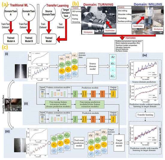 ML, a subset of AI, provides the capacity to learn and improve the systems from experience and thus, is widely applied in different areas of manufacturing []. In recent years, ML has been found to be a useful tool for in-process tool condition monitoring [], predicting self-induced vibrations and chatter in heavy-duty milling machines [], by creating complex analytical models and simulations. The experimentation was carried out to predict chatter based on different machine positions and milling directions []. As the initial machining condition changes, the ML model needs to be revised according to the new data, and thus, broader applications of ML methods are hindered. Transfer learning (TL) methods help to minimize this problem by transferring knowledge from a source domain to a different but related domain, as depicted in Figure 9a,b []. TL is applied to the online prediction of surface roughness under different cutting conditions, as illustrated in Figure 9c []. However, limitations exist in automatic labeling data to the target the domain model. Additionally, a hybrid method combining numerical modeling, cutting dynamics and an artificial intelligence surface roughness prediction model is notable for future research.