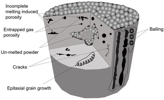 Additive manufactured parts may experience geometric flaws [] due to surface defects (such as balling, high surface roughness, surface deformation, such as warping and distortion) and sub-surface defects, such as porosity []. Cracking, delamination on deposited material and residual stress are the thorniest issues associated with the AM technologies [] for the SLS process, as illustrated in Figure 10. The presence of unwanted defects becomes the major bottleneck for widespread implementation of additive manufacturing in industries. Moreover, the mechanical properties, quality and reliability of AM manufactured parts depend on: (i) the chamber conditions, such as temperature, pressure, oxygen concentration []; (ii) the build environment condition, such as vacuum, inert gas or ambient []; (iii) laser deposition parameters, such as laser power, laser scanning speed, scan line spacing, power layer thickness and laser pulse length []; (iv) material morphology, such as chemical compositions of powders, particle size/shape, powder porosity, impurity and powder size distribution []; (v) machine specification, such as nozzle aperture, nozzle orientation and number of nozzles. The combination of all of these process parameters is mainly responsible for melt pool geometry [], which not only determines the geometry and quality of the deposited track, but also directly relates to the local microstructures, defect size, defect morphology and mechanical performance (ductility and fatigue strength, corrosion resistance) of the built part []. Therefore, the process monitoring of AM can provide an insight into the influence of various parameters and can help in improving the build structure.