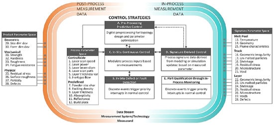Most of the surface and subsurface defects are directly or indirectly caused by the overheating and uneven thermal distribution. Although several techniques have been explored for the in-situ monitoring of AM processes, vision-based techniques are widely employed due to ease of use and cost-effective hardware. Despite advancement in sensing capabilities, most of the AM processes are open loop. In one of the pioneering works, Mani et.al [] categorized 38 parameters into three groups by establishing the hierarchy of process parameters, process characteristics and built qualities. Subsequently, a framework for the control strategies is proposed, as shown in Figure 11 [].