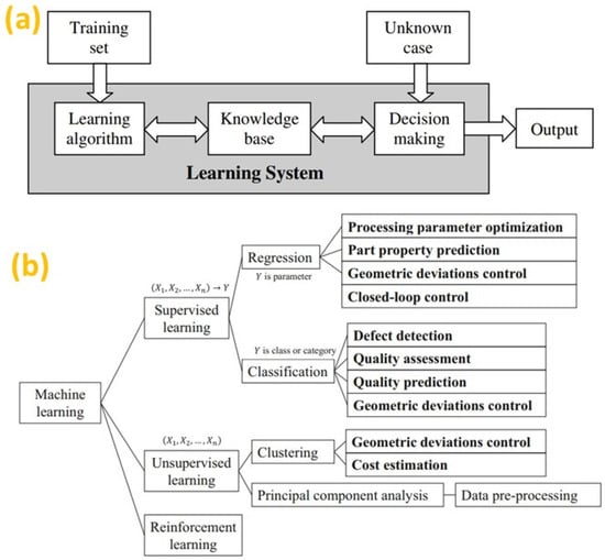 (a) General configuration of a machine learning system (reprinted with permission from []. Copyright 2004 Elsevier B.V.). (b) Taxonomy and applications of ML in AM as proposed (reprinted with permission from []. Copyright 2020 The Minerals, Metals & Materials Society).