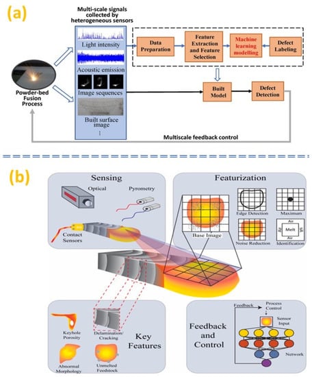 The additive manufacturing life cycle consists of five stages, namely: (i) design; (ii) process and performance optimization; (iii) in-situ process monitoring and control; (iv) post-process monitoring and control; and (v) testing and validation []. ML can be used in each stage to support new designers in the additive manufacturing design phase []. Moreover, faster and more accurate defect detection with ML techniques will drive the research efforts in this area. However, the unavailability of the common data format and standards remains a hurdle to overcome soon for the wide-scale adoption of the ML in AM applications. For instance, when a melt pool is present in the AM process, the visual information acquisition of the deposition area can be challenging due to the brightness and frequent sparkling, not to mention the evaluation of the defects thereafter. Therefore, emerging sensor techniques are heavily utilized and studied for AM processes, to provide both visual and non-visual information to better assist the in-situ monitoring process. Hence, intelligent detection technology utilizes on-site detection and intelligent algorithms combined with ML for image processing []. Thus, the sensing method, dataset preparation, feature selection and modelling algorithm are becoming focused along with the data fusion and feedback control, as shown in the framework illustrated in Figure 13a [].