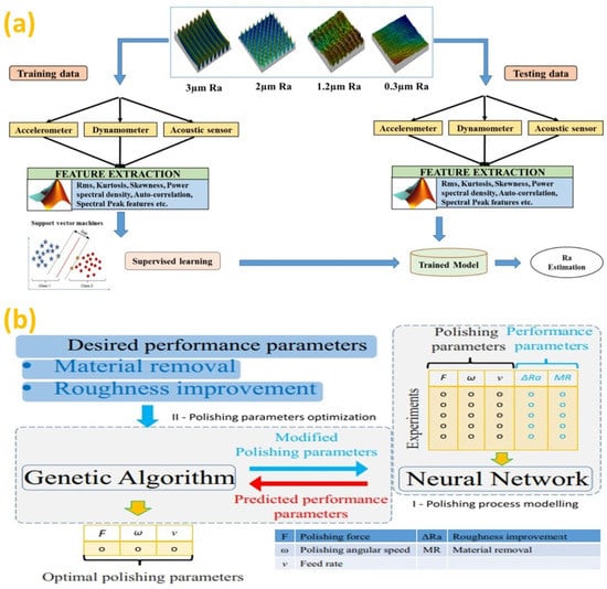 Nowadays, machine learning is gaining momentum with the aid of soft computing techniques and is moving forward to be an integral part of post-processing machining operations. The noteworthy aspect is that researchers have already started employing soft computing assisted machine learning techniques in the field of post-processing. An effective algorithm was developed for the conventional polishing method to eliminate the problem of non-uniform material removal on uneven surfaces during polishing []. Both NNW and GA were utilized for formulating the algorithm where the former was intended for process model generation, whereas the latter was meant for polishing parameters optimization. The proposed strategy can be interpreted from Figure 15b []. Initially, the polishing process was modelled through AI using a neural network. The results obtained from the experiments are then used to train NNW followed by testing with samples not used in the training stage. Then, the desired surface finish improvement and material removal are fed to the algorithm, which enforces GA to find the optimum polishing parameters. Therefore, machine learning regression methods were utilized for prediction of surface roughness [].