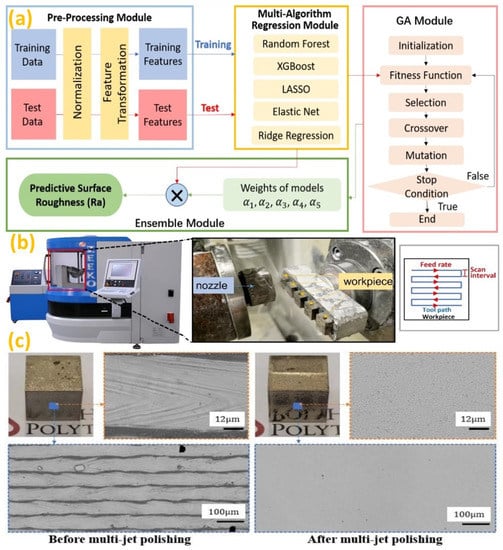 Artificial intelligence (AI) establishes its feasibility in even micro/nano-scale finishing operations. A recent study adopted artificial viral intelligence in abrasive flow nano-finishing process using the virus evolutionary genetic algorithm (VEGA) []. The study proved that VEGA could better adapt to the trends with experimental values in terms of surface finish. In recent times, image processing based on machine learning was deployed using convolutional neural networks (CNNs) to determine the laser polishing conditions responsible for contributing to better surface integrity []. Furthermore, electrochemical jet machining was utilized to finish AM parts created by PBF and to subsequently micro-pattern these for increasing part functionality []. In multi-jet polishing (MJP), a surface roughness prediction model was developed based on ensemble learning with a genetic algorithm (ELGA), as illustrated in Figure 16a–c [].