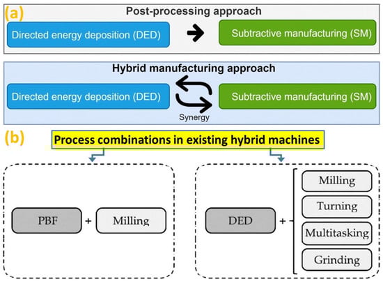 (a) Traditional post-processing and hybrid manufacturing approach (reprinted with permission from []. Copyright 2020 Springer Nature). (b) Different process combinations in hybrid machines [].