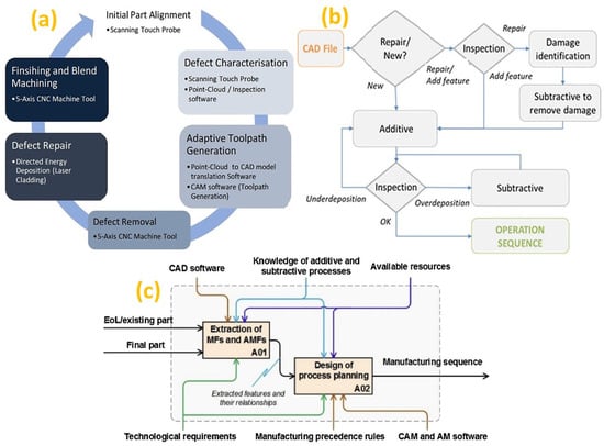 (a) Description of RECLAIM remanufacturing (reprinted with permission from []. Copyright 2015 Elsevier B.V.); (b) flow chart of the operation sequencing algorithm of the HM process []; (c) framework for the design of process planning (reprinted with permission from []. Copyright 2018 Elsevier B.V.).