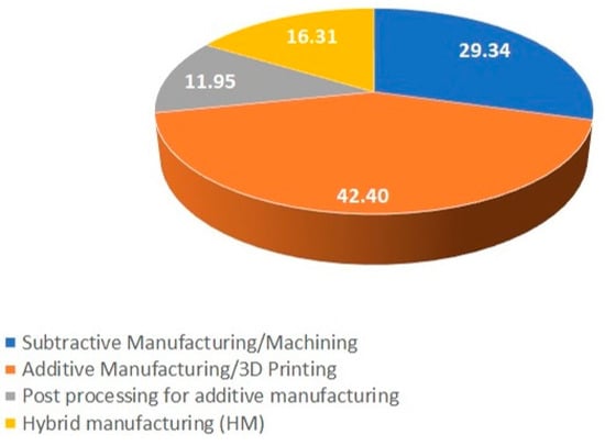 Although traditional post-processing improves surface quality, conventional methods are not suitable for complex structures, especially for difficult-to-cut materials [], thus, both the subtractive and transformative manufacturing technologies are combined with AM for improvement of part quality and process performance []. Therefore, the concept of hybridization [] goes beyond post-processing, as illustrated in Figure 17a [], where the hybrid-AM processes are usually cyclic processes involving synergy between both techniques, and are distinguished from postprocessing operations. Figure 17b shows the division of groups according to the primary additive technique [] of PBF-based processes (directed to produce complex whole parts) and DED processes (focused on the generation of coatings). Thus, DED process can be combined with subtractive techniques and many machine tool builders are developing hybrid machines to overcome the AM drawbacks of low accuracy and high surface irregularities []. Combining multiple processes is advantageous to build an all-in-one hybrid machine [] to make the best use of the strong points of each technology [,] with an aim of cost saving during manufacturing.