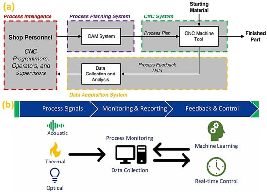 Like the smart house, smart manufacturing is an overwhelming term used to describe the futuristic industry. The advancement and modularization of computers and electronics-initiated automation in manufacturing, is known as the modern manufacturing era. Nowadays, machine tools, critical components of manufacturing, are operated mainly by the CNC (computer numerical control) system with minimum human intervention. As with the machines, raw materials are also handled by automated conveyors or AGVs (automated guided vehicles) and stored in ASRSs (automated storage and retrieval systems). Automated manufacturing can be categorized in various ways depending on the scope and degrees of automation and intelligence in manufacturing []. Two significant aspects of manufacturing are subtractive and additive manufacturing. Subtractive manufacturing, in other words, machining, also has recently become highly automated and intelligent.