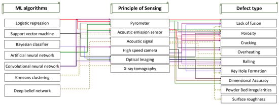 Additionally, following the recent trend towards the IoT-based Industry 4.0, closed-loop control systems and smart integrated devices are rising rapidly. Both academic research and industrial development are generating continuous new solutions, especially since progresses in ML and AI have enhanced the understanding of monitoring results of various AM processes even beyond the limit of human observations. ML or AI to assist in decoding the information acquainted has been a dominant trend in recent studies, which helps the system to identify microporosity [], microcracking [], melt pool conditions [] and material feeding (powder bed) stabilities. By establishing a closed-loop feedback system, the acquainted information from monitoring can be directed back to the controller to improve the process in different ways. However, due to the complexity of the process parameters, from fluidic dynamics to thermal dynamics, the rapid solidification of melted material can make traditional process monitoring approaches difficult, thereby a major challenge becomes the prediction of the AM melt pool. Furthermore, there are various ways for monitoring the manufacturing process, as well as various types of sensors, as shown in Figure 13b []. Though acoustic and thermal sensing approaches can provide reliable data, the prediction is still challenging. This could be improved through ML and AI, with sufficient training data captured within a controlled environment. The sharing of datasets can be a promising trend for understanding such complex thermal processes across different platforms.