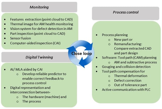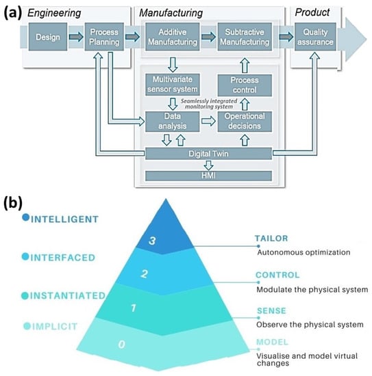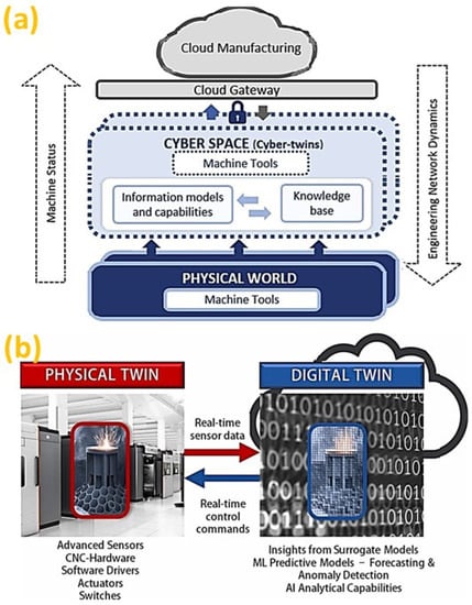 Cloud manufacturing (CM) can be adopted to overcome the challenges associated with the traditional systems for on-demand and reliable manufacturing capabilities []. To realize the smart factory [], intelligent systems will require to replace human decisions, where production will be controlled autonomously and dynamically with a high degree of automation []. Thus, Industry 4.0 focuses on the subtractive, additive and hybrid techniques to connect with the cyber/digital realm. In this regard, a cloud-based framework was developed for online diagnosis architecture [], where the machine tool and sensor system are connected to the cloud to coordinate and control the operation in a cyber physical system (CPS). Moreover, the smart monitoring can be implemented to reduce the risk of damaging workpieces, cutting tools and the machine itself by linking the physical resources (machines, tools, workpieces) with complex CPS with the use of sensors and IoT for the development of smart machining operations to increase productivity []. Additionally, an image-based system is considered to predict the tool wear relating to the surface quality of the machined parts with varying cutting conditions in subtractive manufacturing (SM) []. A digital twin (DT) driven process parameter optimization and surface roughness prediction method is proposed for real-time machining process monitoring []. Intelligent machining tries to enable intelligent behavior in the machining system [] to avoid defects from human errors as, machines learn and adapt to optimize machining processes. Thus, the emergence of digital twin (DT) technology provides an opportunity to incorporate digitization and intelligence in materials processing technology. Additionally, the adoption of digital technologies can shift the paradigm across all manufacturing sectors []. In fact, several innovations have enriched additive manufacturing (AM) in various dimensions, including smarter materials and functional structures, smart and agile manufacturing ecosystems capable of traditional manufacturing [].