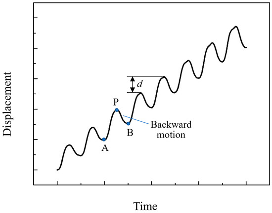 In the previous stick–slip piezoelectric actuator, we determined that when the driving frequency is 60–100 Hz or higher, the displacement curve of the actuator output is relatively stable. When the driving frequency is further reduced (below 10 Hz) to obtain a smaller actuating step, as shown in the Figure 1, the step has obvious backward motion. This situation has also been described in other research papers. In most cases, d in the figure is defined as step distance. For precision positioning, however, the existence of backward motion restricts the realization of higher accuracy. It can be seen from the analysis of the above figure that in a cycle of movement, the AP segment is the driving foot that moves forward in the rising signal. Before reaching the peak P, there is a deceleration phenomenon. At this time, the signal has been converted from the rising segment to the falling segment. The guide stops gradually in the inertia until the PB segment moves backward.
