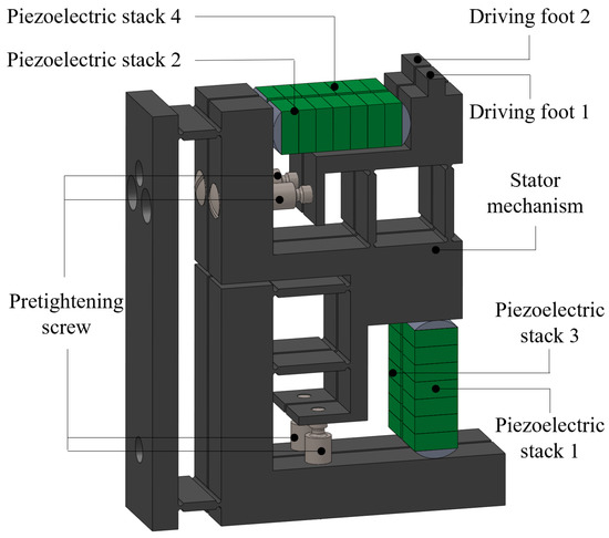 A double-flexible hinged laminated double-foot piezoelectric linear motor is developed, the structure of which is shown in the Figure 1. As can be seen from this Figure 2, it consists mainly of a laminated stator, a clamping mechanism, a preload mechanism and a moving guide. The overall structure of the laminated stator is shown in the Figure 3. There are two piezoelectric stacks in each stator. By using preload screws, preload force is applied to the piezoelectric ceramics with semi-circular pads at both ends. A double flexible hinge guide mechanism is designed to be positioned in the transverse and longitudinal parts of the stator structure. Through collaboration between the clamping mechanism and the preload mechanism, it is ensured that the stator and the actuator are in sufficient contact. When there are specific signals inputted into the piezoelectric stacks, the two groups of piezoelectric stacks on the stator structure of each layer generate transverse and longitudinal vibrations respectively on the top of the driving foot, thus forming a closed motion path. Relying on friction force, the guide is driven to move in a straight line.