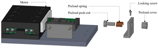 In order to realize the joint action of both feet, it is necessary to ensure that the contact state of both feet is consistent. On the one hand, integrated processing is adopted in the design to reduce the error, and on the other hand, repeated adjustment is required in the assembly to achieve the best state. The installation method of adopting rigid preloading mechanism has defects in ensuring that both feet contact the guide at the same time. It is difficult to further adjust the preload during assembly, and it is difficult to ensure simultaneous contact of both feet. So the flexible connection preloading mechanism is used to replace the original rigid connection mechanism. It is found that the flexible connection preload mechanism can effectively achieve the adjustability of the preload state. By adjusting the length of the spring, it is easier to test the required preload state in assembly. According to the preload mechanism, the spring is adopted as the main body and the push rod is used in combination to assist pressing, as shown in the explosion diagram of the Figure 5. In addition to providing effective thrust, it also ensures a certain level of elasticity.