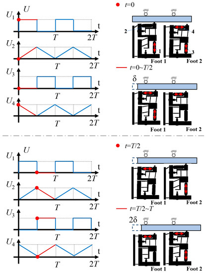 Square wave and triangle wave signals are applied to four groups of piezoelectric stacks respectively, with the actuator used to output alternating step motion. According to the Figure 6, the motion of the actuator during a cycle can be classed into four typical states.