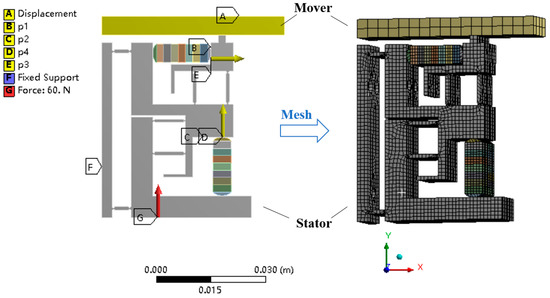 On the basis of the analysis of the stator step, the finite element simulation of the stator drive foot and the output motion of the mover is carried out. The initial conditions and mesh division are shown in the Figure 9. Hex dominant method is used in mesh when the body size is defined as 1 mm, and the element number is 20,716. In the simulation, the stator bottom is applied with a preload of 60 N, the left side is fixed, and the mover only retains the transverse displacement. The stator and mover are in frictional contact, and four piezoelectric stacks are applied with corresponding input signals. Because of the low actuation frequency, the quasi-static process is used for analysis.