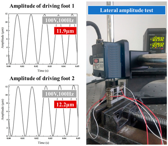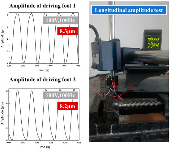 Prior to the test on actuator performance, the stator was tested for amplitude, so as to determine the outcome of installing the piezoelectric stack in the stackable stator. With a sinusoidal voltage signal of 100 V 100 Hz applied to the stack, the transverse and longitudinal performances of the driving feet were evaluated using a laser displacement sensor. As shown in the Figure 14, the longitudinal amplitude of driving feet 1 and 2 is 8.3 μm and 8.2 μm on average, respectively. As also can be seen from the Figure 15, the average lateral amplitude of driving feet 1 and 2 is 11.9 μm and 12.2 μm, respectively. The transverse and longitudinal displacements are highly consistent with each other for the two driving feet.