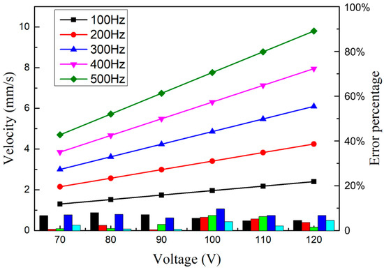 To predict the output speed under the input condition, the corresponding voltage and frequency values can be substituted respectively, as shown in the Figure 18. The formula was used to compare the fitting data with the actual value, with the error obtained in percentage for each velocity point. It can be seen from the figure that the error of each velocity point under the context of linear fitting falls within 10%, mostly below 5%. Thus, the output performance of the actuator can be better described.