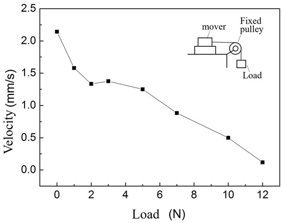 Apply 100 V, 100 Hz square-triangle wave signal to the piezoelectric stack, and hang weights on one side of the guide to test the thrust of the motor. The load characteristic curve of the actuator is shown in the figure. It can be seen from the Figure 19 that the motor velocity decreases rapidly with the increase of load. The maximum thrust is about 12 N, and the load characteristics still need to be improved.