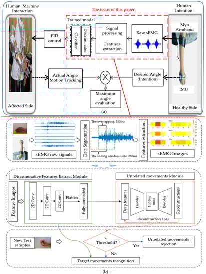 The overview of the system: (a) Bilateral rehabilitation based on joint pattern recognition from sEMG signals [4]; (b) The overview of the proposed method in this paper.