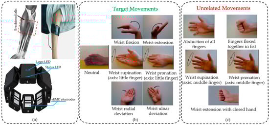 Experimental devices and data acquisition scheme: (a) Thalmic Myo armband and schematic diagram of the experimental data acquisition; (b) The seven target movements; (c) The five unrelated movements.