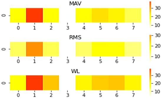 Then three time-domain (TD) features are extracted for the signals of muscle activity state, that is, root mean square (RMS), mean absolute value (MAV), and waveform length (WL). They are calculated with Equations (2)–(4). The RMS, MAV, and WL are the most commonly used TD features in motion pattern recognition [5,7,10,12,30], and they are closely associated with the amplitude of sEMG, which can directly reflect the intensity of muscle contraction with low computational complexity. The studies [7,28,32] also showed that the combination of TD features and a small-scale CNN could reach satisfactory control performance. Therefore, the CNN combined with three time-domain features is applied in this paper with the advantages of simple network structure, less computation, and excellent results.