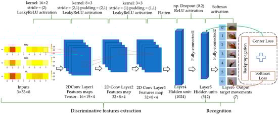 Many studies [6,15,24,25,26,27,28,29,30] have verified the effectiveness of the convolution neural network for mining the internal information of sEMG signal. In this procedure, CNN is used to extract discriminative features from low-density sEMG images. The input of CNN is the sEMG feature images. This module makes two contributions: one is to provide AE with the deep discriminative features of sEMG signals, and the other is to identify target movements. The architecture of the CNN developed in this paper is shown in Figure 4. This CNN contains six layers, including three convolutional layers, two fully-connected layers, and an output layer. Three 2D convolution kernels ( filter with a stride of 2 and a padding of 0, filter with a stride of and a padding of , and filter with a stride of and a padding of ) are used to process the sEMG images for the first three convolution layers in turn, and the convolution layer activation function is LeakyReLU activation. During training, the dropout rate between Layer4 and Layer5 is set to 20% to prevent model overfitting. The adaptive moment estimation (Adam) algorithm is adopted with the batch size set to 32 to train the network. We optimized the network using the training samples for 200 epochs with a learning rate of 0.0001. The trained CNN is used for extracting discriminant features, and the parameters are fixed during the training of the AE. The center loss and softmax loss are applied to optimize the network, which makes the deep characteristics of the fifth layer output of the network discriminative. Generally, only softmax loss is used for CNN model training, as shown in Equation (5).