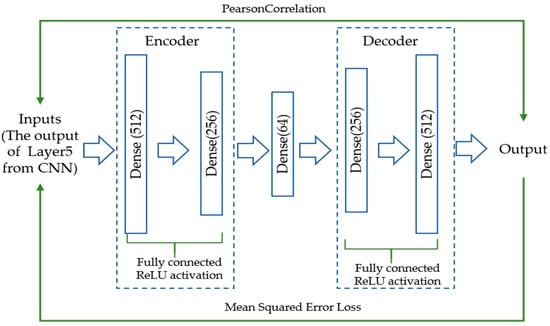 In this part, the AE network is trained to reject any samples that do not belong to the target movements by calculating reconstruction error. The CNN model developed in this paper can recognize target movements well, but it does not recognize the performance to reject unrelated movements. The AE network framework adopted by the proposed method is shown in Figure 5. The network adopts a mirror architecture, which can be divided into an encoder and a decoder. The encoder compresses the input into a low dimensional feature space, which only retains the main mode of the input data, and then the decoder can recover the raw data. If the distribution of the input and training data is different, then there are obvious differences in the output of the encoder, and the decoder is unable to recover the input data causing large reconstruction errors. The mean square error (MSE) loss is used to train AE. The input of AE is the layer5 output () of the CNN network on the training dataset of the target movement samples. The Adam algorithm with a mini-batch (set to 32) is adopted to optimize the parameters in the network. The learning rate is set as 0.0001 with the 1000 epochs to train the AE network. To test the discriminant network, the Pearson correlation (PC) [16] is applied to measure the difference between the input data and the reconstructed data as shown in Equation (11).
