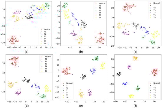 To verify that the center loss function is available for optimizing deep features to make them separable and discriminative, the t-distributed stochastic neighbor embedding (t-SNE) [34] is applied to reveal the distributions of the deep features with different values, as shown in Figure 6a–i. Figure 6a shows the distributions of deep features trained only with the softmax loss using the t-SNE visualization method. Although these deep features have good separability in high-dimensions, the intra-class cluster capability of samples is inadequate and even overlaps. Therefore, these features have poor discrimination and may be unavailable and difficult for the rejection of unrelated movements. As shown in Figure 6b–i, the two-dimensional deep features distribution of training samples is shown when is , , , , , , , and , respectively. The hyperparameter impacts the model performance by influencing the distributions of the deep features. It can be seen that the larger the value, the smaller the intra-class spacing, that is, the more compact the deep features of each category are extracted. The joint supervision loss is used to train CNN, which reduces the inter-class spacing of deep features for samples, and the intra-class spacing is also effectively reduced simultaneously, which shows the effectiveness of center loss for the distribution of deep features where denotes the weight of center loss. Figure 6a–i shows that the deep feature distribution is affected by the hyperparameter , which is crucial to the rejection performance of unrelated movements.