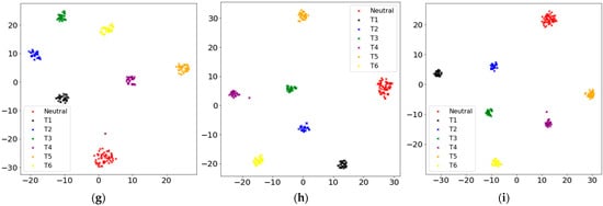 Visualization of deep features extracted from all subjects and the scattered points represent samples with colors to indicate different motions: (a–i) Visualization of deep features when is set as , , , , , , , , and respectively.