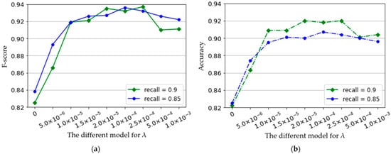 The mean F-score (a) and mean accuracy (b) of all subjects when the recall is defined as and , respectively, achieved by the trained models with different .