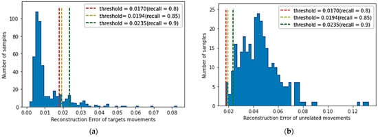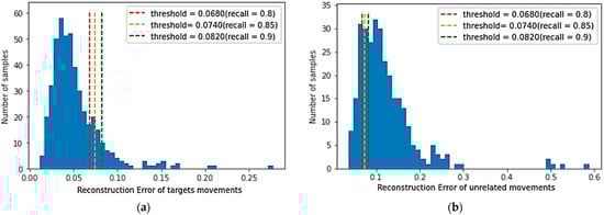 A larger recall factor will make the threshold of all target movements categories larger, and more reconstruction errors in target movements samples are lower than the threshold. The smaller recall factor will reduce the threshold value of the target movements category, inevitably reducing the target movements recognition performance, but it will strengthen the rejection performance of unrelated movements. The reconstruction error of the target motion is relatively small, whereas the reconstruction error of the unrelated motion samples is significantly higher than that of the target category samples. As shown in Figure 8a, the reconstruction loss distribution is described of target movements on the validation dataset, and Figure 8b shows the reconstruction loss distribution of all unrelated movements in the test dataset by the trained model (). When the recall of the validation dataset achieves 0.80, 0.85, and 0.90, the corresponding thresholds are obtained, which are 0.0170, 0.0194, and 0.0235, respectively. As shown in Figure 8a,b, it is apparent that most of the sample reconstruction errors in the verification dataset are distributed on the left side of the threshold, whereas most of the reconstruction errors of unrelated samples are distributed on the right side of the threshold. Therefore, there is a threshold to distinguish target movements and unrelated movements.