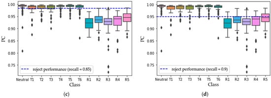 Figure 8c,d show the PC distribution for each movement, that is, the reconstruction error distribution of each category sample after the trained model on the test dataset when the recall of the model is 0.85 and 0.9, respectively. The blue dotted line indicates the rejection performance of the unrelated movements, which are 98.3% and 95.0%. Therefore, an appropriate threshold can effectively segment the target and unrelated samples.